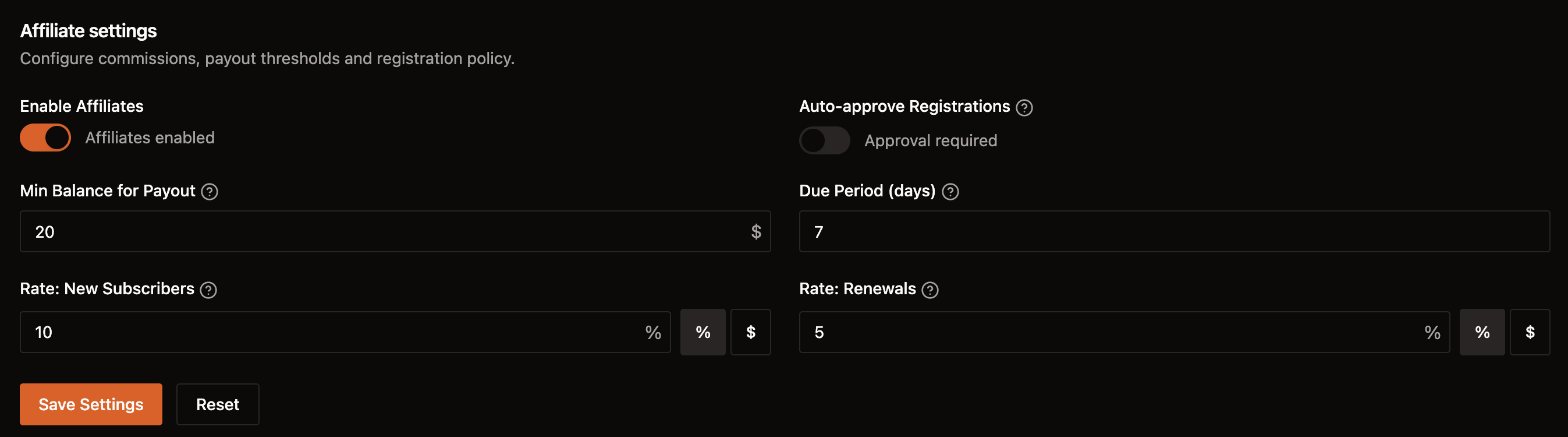 - Min Balance for Payout: The minimum amount an affiliate must earn before a payout can be generated.